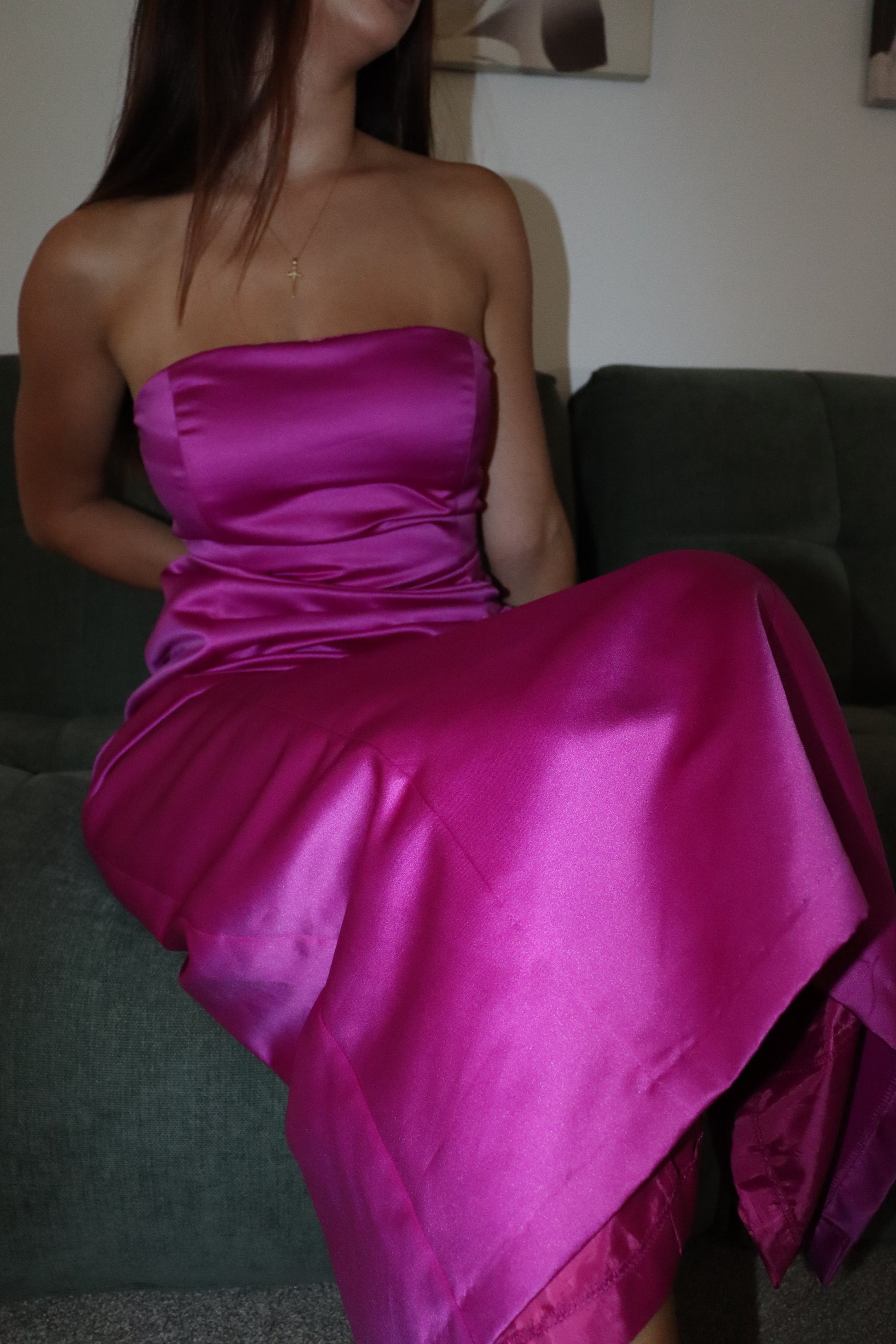 A sleek strapless vibrant satin gown perfect for formal occasions!